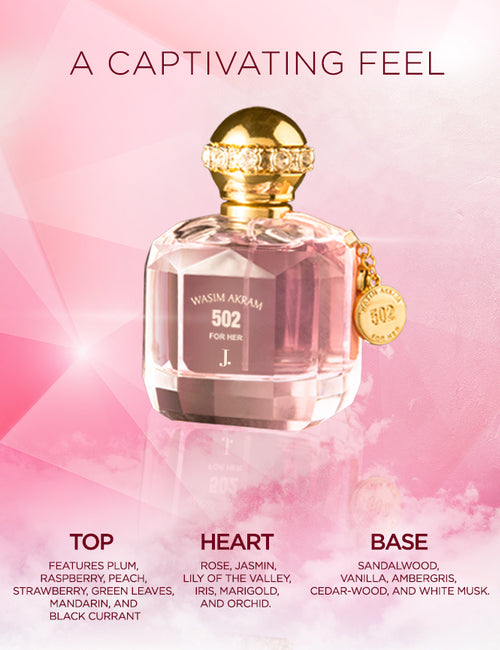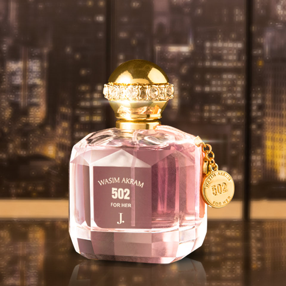 Wasim Akram 502 is a vivacious contemporary fragrance for women. It reveals an attractive and delicate outlook of a lady in a crystal cut bottle with sparkling stones studded in the gold head of the fragrance. The pink juice is stirred by the citrus of mandarin, and a lively fruity melange of peach, plum, raspberry, strawberry, green leaves, and blackcurrant.